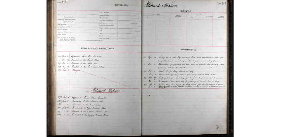 Although Richard was promoted to First Class Constable within a year, he wasn’t without his disciplinary problems – losing equipment, being late, being absent from duty, drunk on duty.