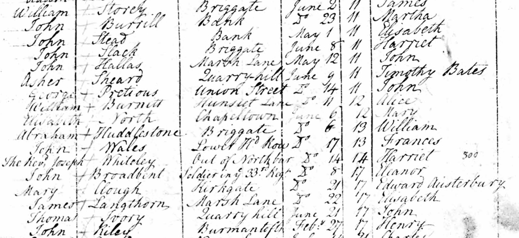 She was born Alice Burnett on Hunslet Lane in 1791, and her father’s name was William. There’s no trail to follow for him, and Alice’s mother isn’t named.