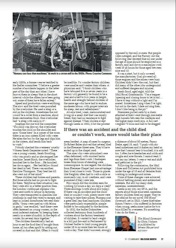 This was real, and the dig for the site of what became Victoria Gate shopping centre in Leeds brought up the bodies of local children, factory children, who’d lived short, horrific lives. They weren’t the exception, as testimony to the Sadler Committe in 1832 showed. I’m profoundlky grateful that Big Issue North asked me to write about the reality. It’s in the issue published today (January 17) – and it’s a magazine that’s always worth your money.