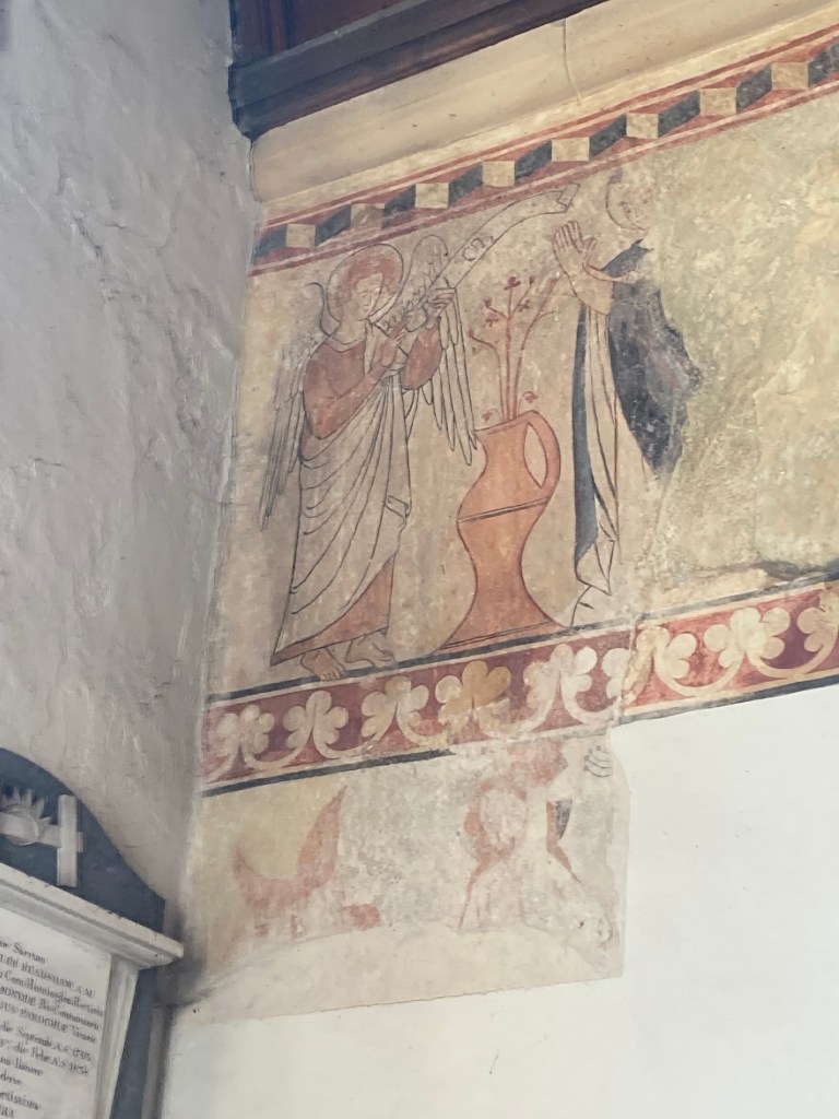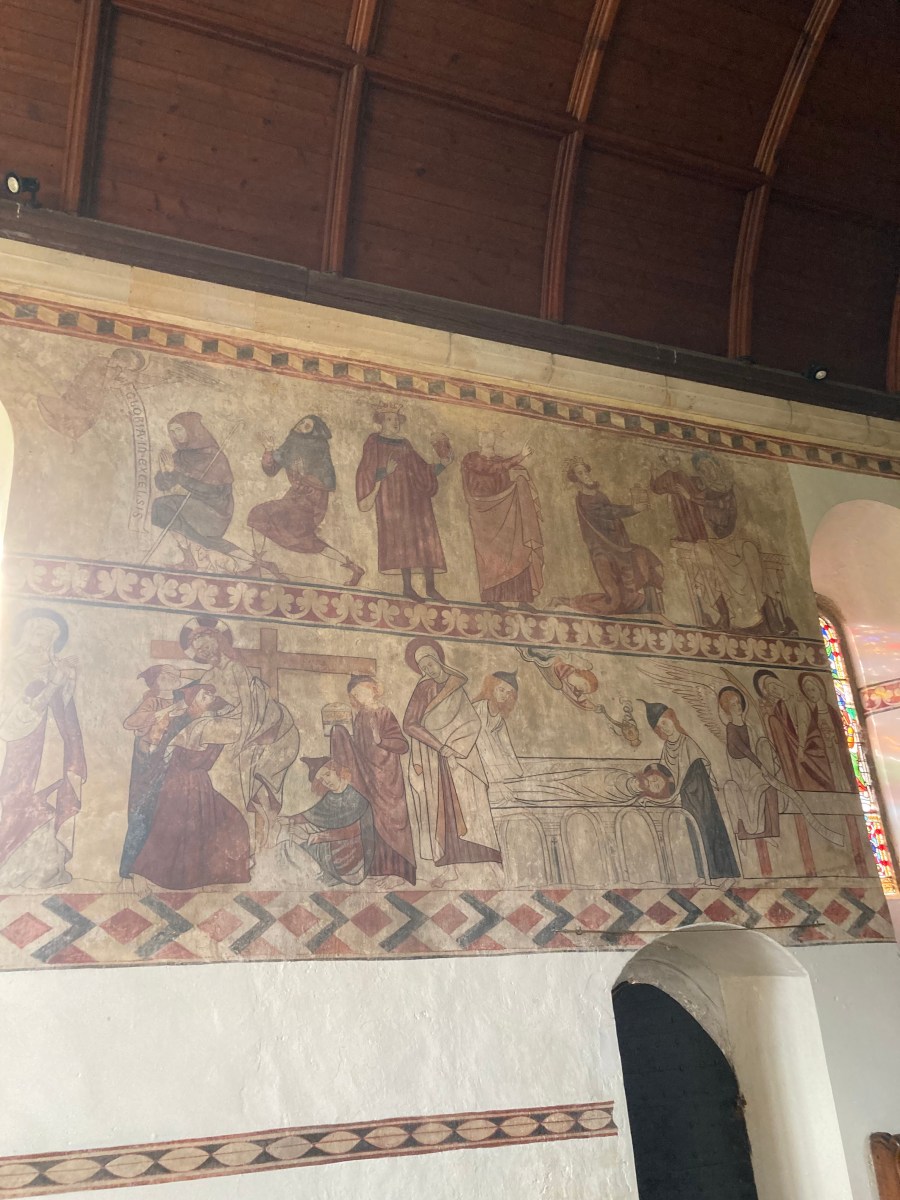 It’s estimated that the paintings date from around 1250 CE and tell different stories from the Bible. In those times, few could read, and the number that could read Latin – the only language in which the Bible was available here – was smaller still. Not even all priests would have been fully literate. Think of these paintings as holy comics or cartoons to tell the stories to the congregation.