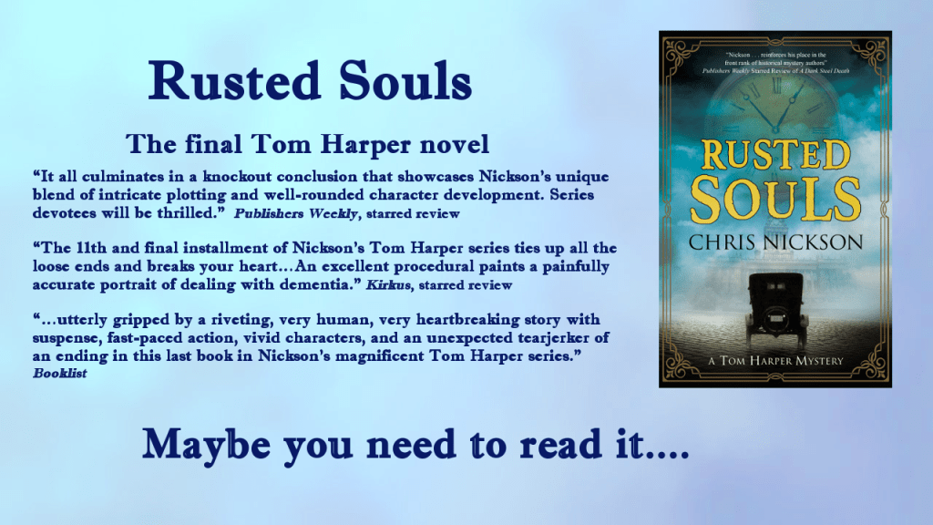 Then another review from the US trades, Kirkus Reviews. I was overwhelmed when they gave it a starred review, sating “The 11th and final installment of Nickson’s Tom Harper series ties up all the loose ends and breaks your heart…an excellent procedural paints a painfully accurate portrait of dealing with dementia.”