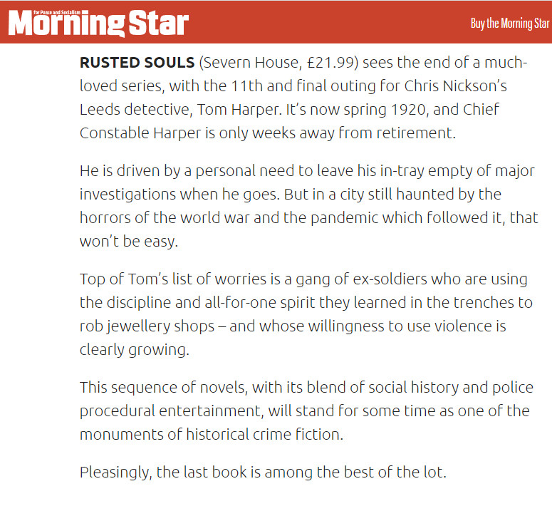 A towering review from the Morning Star, describing the Tom Harper series as “one of the monuments of historical crime fiction and Rusted Souls as “the best of the lot.”