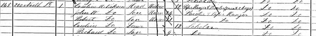 Isaac Jr.’s son William Robert was yet another painter. Born in 1837, he learned the trade properly, and the 1861 census lists him as a journeyman painter, so he’d obviously completed his apprenticeship. At that point he was living on Wade Street with his father (although in the census he’s shown as a servant, strangely, and his uncle William is also shown there, again as a servant, although he has his own census listing with his family on Elm Street). But by 1868, he, too, was on the electoral roll.