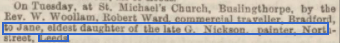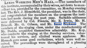 Isaac married Elizabeth Watkinson, who was a year older than himself and the daughter of a wool stapler, at the Parish Church in Leeds in October 1834. He would have been 19. Their son, William Robert Nickson, was born in 1837. On the 1851 census, Isaac was listed as a painter and living at 50, Birch’s Yard.