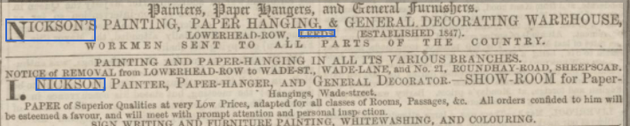 George and Isaac seemed to do well enough for the best part of a decade. Then, in October 1856, Isaac announced in a newspaper ad that they’d dissolved the partnership “by mutual consent” and that he had new premises on Wade Street (although he’d also be in the place on Lowerhead Row until 1859). By now he was a sign-writer, furniture painter, whitewasher, and handled ornamental colouring, as well as “painting and paper hanging in all its branches.”