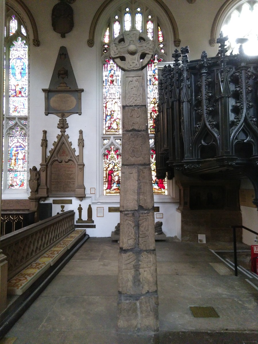 In the 10th century, Leeds stood on the edge of two kingdoms, a cross point, which elevated its status. There were also fives crosses standing outside the church. Not preaching crosses, because the time for those had passed. These were memorials to important people. They were carved and would have been covered in plaster and brightly painted; probably the only splash of colour in Leeds. Along with Christian imagery, there’s also a representation of Wayland the Smith from earlier times, a sign that old and newer religions could co-exist. What remained of the crosses was found in the call of the Parish Church when it was being torn down and rebuilt in 1838. Enough fragments remained to assemble a single cross, which now stands in the church.