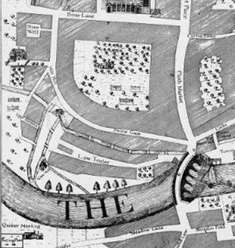In those days, of course, the area wasn’t build up, and the entire ground surround the mills was tenter fields, as seen here on this 1726 map of Leeds, where the area’s called Low Tenter.